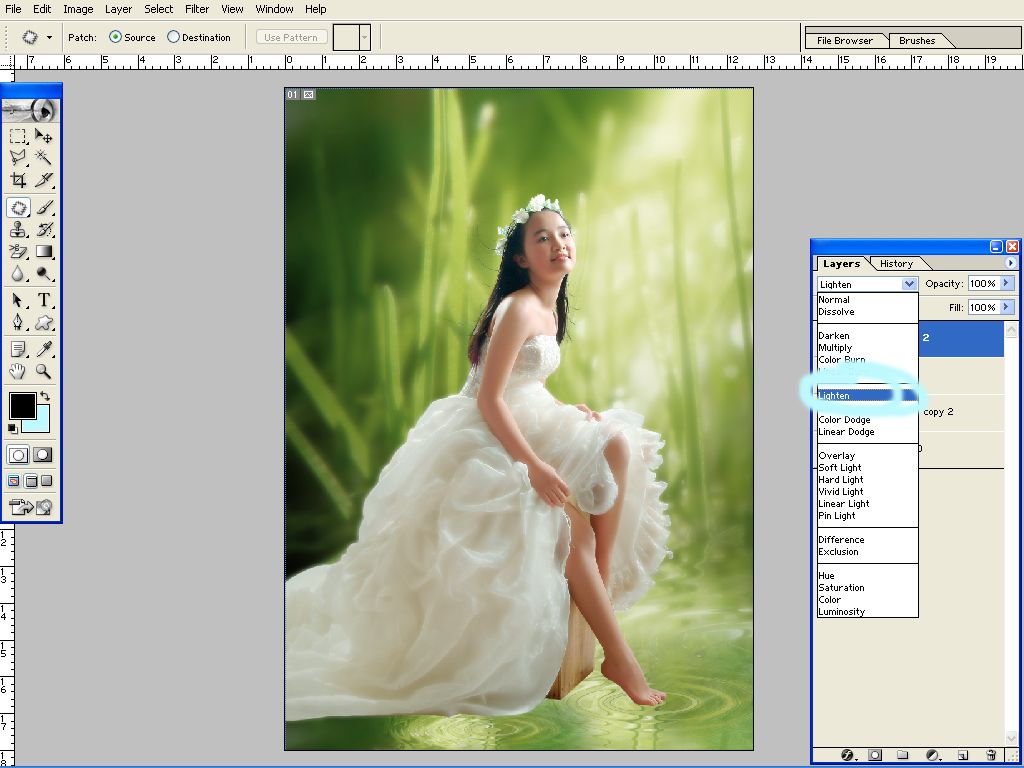 4. Tiếp theo chọn layer nền xanh, và dùng lasso khoanh vùng ánh sáng phía trước mặt cô giá, sau đó và Filter > Blur > Gaussian Blur để làm mở vùng khoanh , tiếp đó ta chọn chế độ hòa trọn Lighten